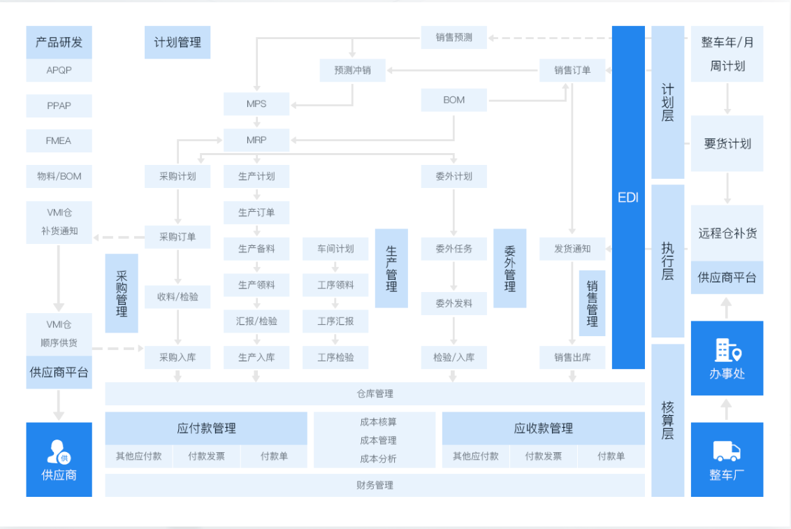 圍繞精細(xì)化計(jì)劃管控、透明化化生產(chǎn)執(zhí)行、全面質(zhì)量管理等作為落地支撐,助力汽車零部件廠商從訂單接收、計(jì)劃、生產(chǎn)執(zhí)行到售后及追溯的全流程管控